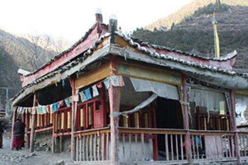 白いチョルテン(仏塔)やタルチョ(祈祷旗)がときどき目に入る。本格的にチベット文化圏に入ったようだ。 たぶん紅葉で有名なミャロ(米亜羅)あたり。道路沿いの村にマニ車のあるお堂を見つけた。中には大きなマニ車がひとつ。グル・リンポチェや観音菩薩…