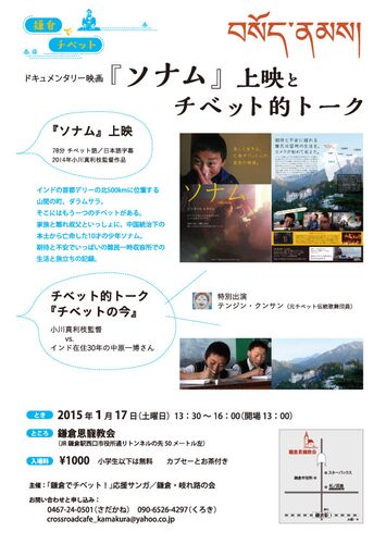 ↑詳細はこちら。クリックすると拡大できます ドキュメンタリー映画『ソナム』上映+チベット的トーク日時:2015年1月17日(土)13:30〜16:00場所:鎌倉恩寵教会(鎌倉市佐助1−9−3) ■映画『ソナム』上映(小川真利枝監督) チベット本土から亡命した10歳…